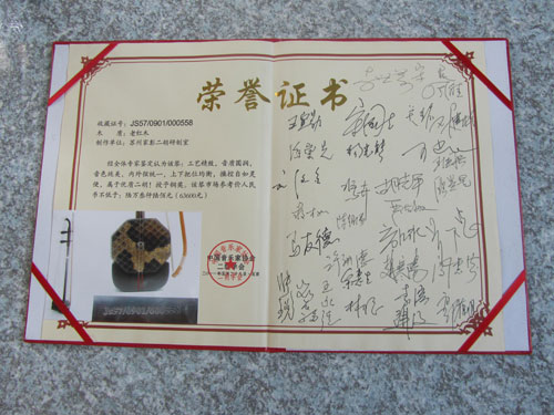 琴體采用蘇州傳統蟲膠擦漆工藝,手工拋光打磨,可清晰顯露出紫檀木細密的毛孔,整琴制作精致細膩,演奏手感非常舒適,上下換把輕松自如,有利演奏技巧的發揮